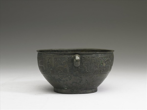 折邊,環耳,斂腹,圈足。腹部飾幾何蟠螭紋。