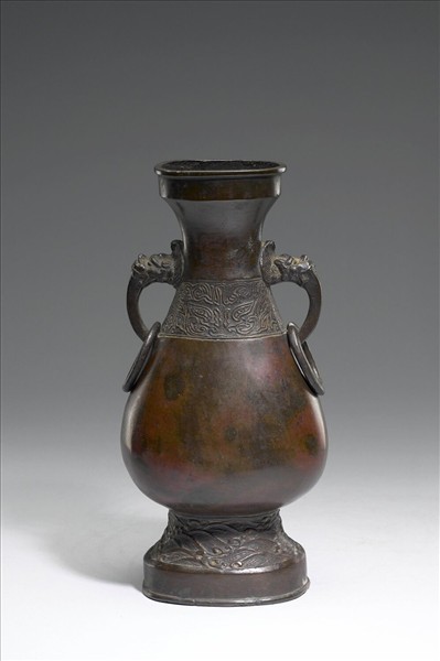 壺,橢圓形口,圓唇,口沿下方直而後內收為頸,溜肩,垂腹,圈足上斂下直,頸部有雙螭龍首耳,下接一環。頸肩交接處飾浮雕獸面紋,圈足收束處飾波濤紋。