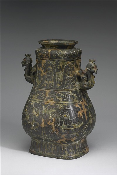 方壺,附鈕蓋,直口,長頸,雙環耳,斜肩,圓腹,階狀圈足,耳做獸首形。器內有銘文。蓋沿與肩部有竊曲紋,頸部為波帶紋,器腹有蟠蛇紋,圈足則為垂麟紋。器蓋與器內壁有銘文。