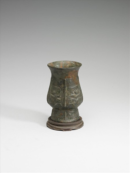 觶,橢圓形,侈口,束頸,鼓腹,圈足微撇,頸、腹、足皆有棱脊,附木座。頸、足皆飾夔紋、雲雷紋為地,腹飾獸面紋、雲雷紋為地。