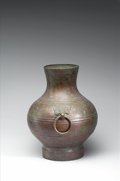 圓壺,鼓腹,圈足,肩上二獸面銜環。肩、腹飾帶紋。