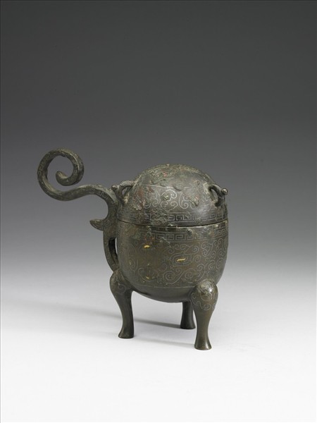 敦,附鈕蓋,蓋上有三環鈕,環耳,圓腹,蹄足,環耳上另作S形把。蓋與腹部以鑲嵌飾獸面紋與雲雷紋。