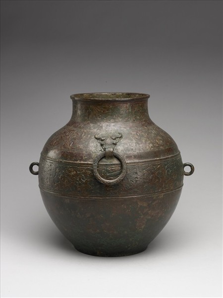 瓿,直口,短頸,斜肩,雙環耳,圓腹,圈足,器肩兩側有獸首銜環,器腹兩側紋飾帶中央並有單環耳。頸、肩與腹部上方飾交龍紋。