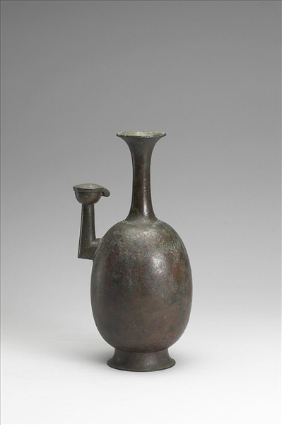 瓶,侈口,直頸,管狀流,圓腹,圈足,流口有蓋,往上折90度,口呈圓缽狀。