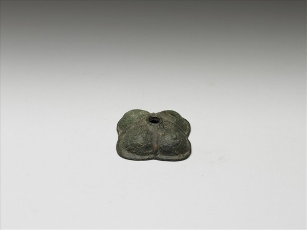 器由四個半球形組合而成,作四瓣形,中間有一孔洞。器身有卷雲紋。