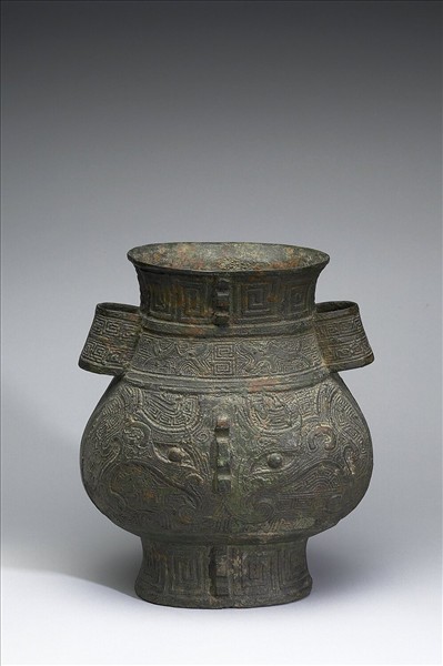 貫耳壺,短頸,鼓腹,圈足,頸、腹、足有棱脊。頸飾雲雷紋、下飾獸形紋與雲雷紋間隔之紋飾帶,腹飾獸面紋、雲雷紋為地,足飾雲雷紋,二貫耳亦飾雲雷紋。