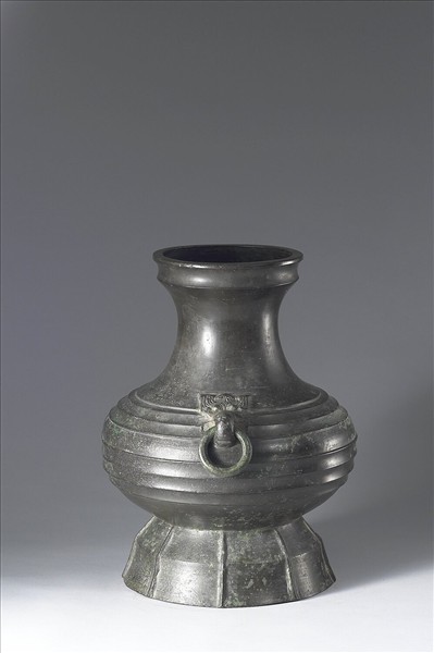 圓壼,侈口,獸首銜環耳,圈足。腹飾瓦紋,足飾直棱紋。足外底有銘文兩字:「卅五」。