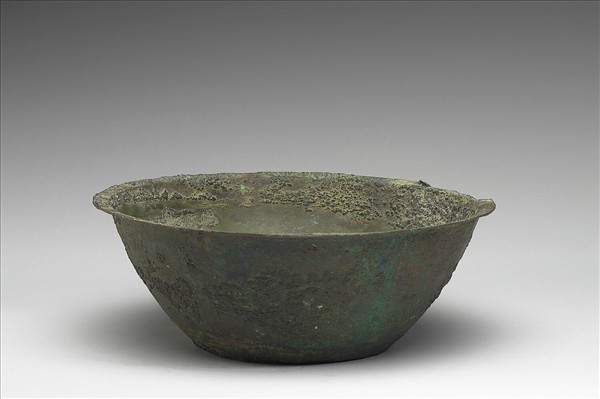 甑,侈口,圓腹,平底,腹壁斜直外敞。口沿傷殘,器表多處有銅器病。