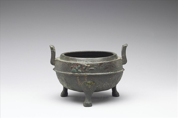 圓鼎,子母口,附耳,蹄足。腹飾弦紋。