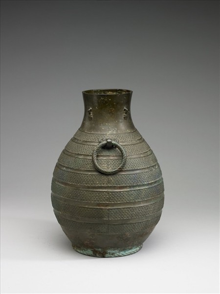 壺,直口,短頸,斜肩,圓腹,圈足,頸部有四環耳,器肩兩側有獸首銜環,圈足做繩索形。腹部飾有蟠虺紋,虺蟲的頭高凸,形成類似乳丁紋效果。
