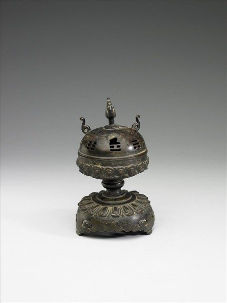 爐,分蓋、承盤、座三部分。蓋以鏤空八卦為氣孔,附三耳,中央有一立鳥。承盤,子母口,平底,飾以蓮瓣紋。座飾蓮瓣紋,鏤空如意雲紋,下有三足。內底有銘三字。