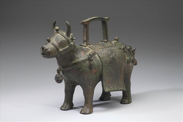 全器以牛為造型,頸繫鈴,昂首直立,四足著地,尾長下垂右頃。背有馱物,負繩絡,馱物飾以幾何紋,背上方有開口。