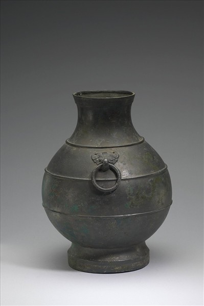 圓壺,盤口,短頸,斜肩,圓腹,階狀圈足,器頸兩側有鋪首銜環。肩部與腹部飾凸棱三道。