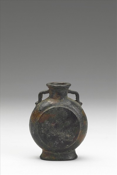 鼻煙壺,以扁壺為造型,盤口,直頸,雙耳,圈足。