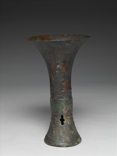 與殷墟中期的主要觚制之一,如:〈亞□觚〉相比,此器器身較矮而薄,腹及足飾有獸面紋,密集式的細線淺浮雕,為紋飾的第三種風格。器制與紋飾作風與殷墟早期小屯M232 R2005觚近,腹足間亞字形足孔極明顯,共有三個;其中一個的部位與範線部位一致,另二個部位則與範線部位錯開。因為全器範線依花紋單位看,可能分為四個單位,這種足孔數目與部位,與範線及花紋單位錯開的現象,在二里岡至殷墟早期時,仍可見。殷墟中期以後,已注意到使足孔縮小,使足孔數目及部位與範線相對應。