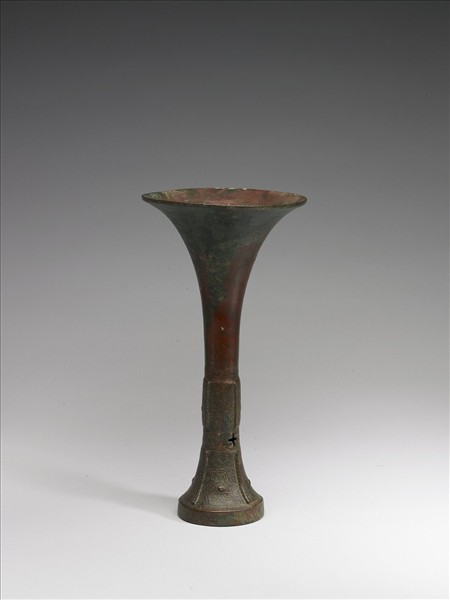 觚,侈口,直筒腹,圈足,腹、足皆有棱脊,腹、足交接處有二十字形孔。腹飾獸面紋、雲雷紋為地,足飾獸面紋、雲雷紋為地。足底外有銘三字。