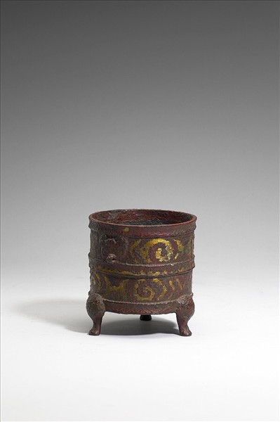 樽,圓筒形器身,深直壁,平底,三獸足,腹作二環耳。器外壁飾嵌金雲紋。