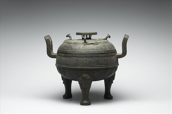 附蓋圓鼎,子母口,附耳,獸足,器、蓋呈球形。腹飾幾何紋,下有弦紋、蟬紋。蓋飾幾何紋,上有三臥獸,蓋鈕為鏤空紋飾。