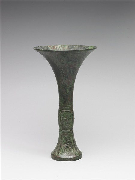 觚,侈口,圈足,腹、足皆有棱脊。腹、足皆飾獸面紋,腹與脰、足交接處皆飾弦紋。