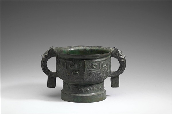 圓簋,侈口,雙耳,圓腹,高圈足,耳作獸首形附珥。腹飾獸面紋,足飾蛇紋,以雷紋為地。
