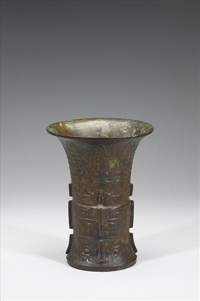 三段式尊,撇口,直筒腹,階狀圈足,有棱脊。脰部為夔龍紋與向上延伸的蕉葉紋,蕉葉為變形獸面組成,腹與圈足處則飾獸面紋。器內底有銘文。