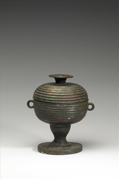 豆,蓋與腹呈圓球體,蓋附圓捉手,子母口,環耳,柄為高圈足。蓋、腹、足均飾瓦紋。