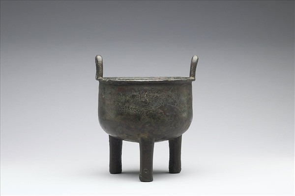 圓鼎,立耳,柱足。腹外飾夔紋,幾為銅鏽所掩。