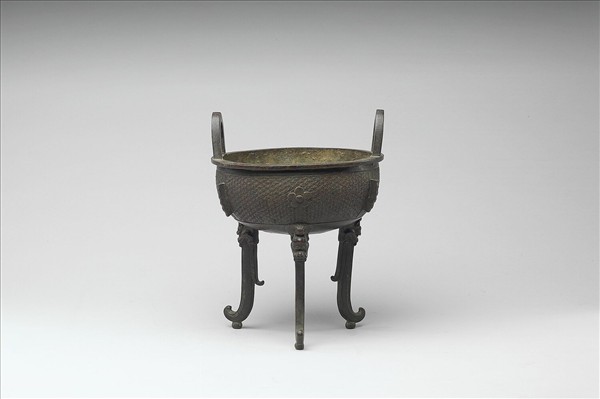 圓鼎,立耳,扁足,腹有棱脊。腹飾花瓣紋,以錦紋為地,足為獸首形。