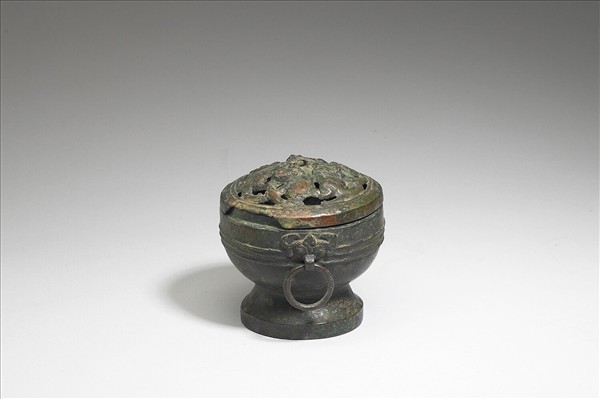 博山爐,子母式口,圓腹,圈足,腹作二環耳。蓋飾鏤空變形蟠螭紋,腹飾弦紋。