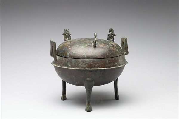 本件器壁甚薄,器腹扁圓,兩側有長方形附耳,器底有細長的三隻蹄形足,器腹下飾一圈弦紋,扁平凸出有如帽沿,與商周時代細窄低矮的弦紋大異其趣。器蓋微弧,頂上的三枚蓋鈕作鳳鳥形,寬闊的鳳尾高卷過頂,造型輕盈生動,使幾近光素的器物鮮活起來。