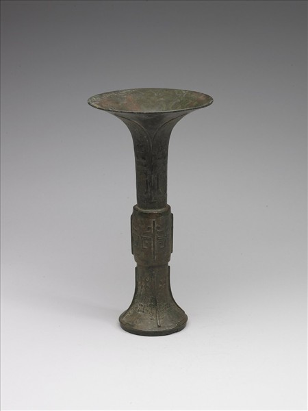 觚,侈口,直筒腹,圈足,腹、足皆有棱脊。脰飾三角形獸面紋、雲雷紋為地,腹飾獸面紋、雲雷紋為地,足飾四瓣目紋與夔紋、雲雷紋為地。
