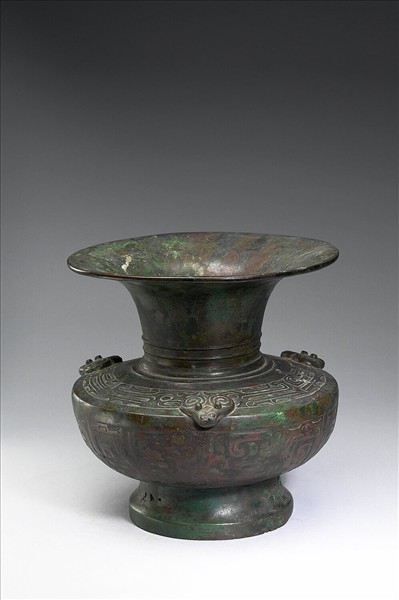 圓尊,敞口,長頸,折肩,鼓腹,階狀圈足,肩部飾有三獸首。頸部有三道凸弦紋,肩部有夔龍紋,腹部則飾獸面紋。