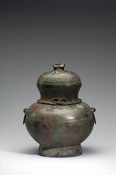 帶蓋圓罍,口微侈,鼓腹,圈足微撇,肩上二獸面銜環,子母口式蓋,管形鈕。頸、鈕飾繩紋,腹、蓋皆飾竊曲紋。
