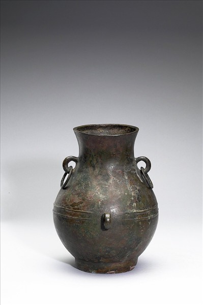 圓壺,敞口,短頸,斜肩,圓腹,圈足,器頸兩側有環耳。器腹有兩道凸弦紋,在一側有一單環耳。