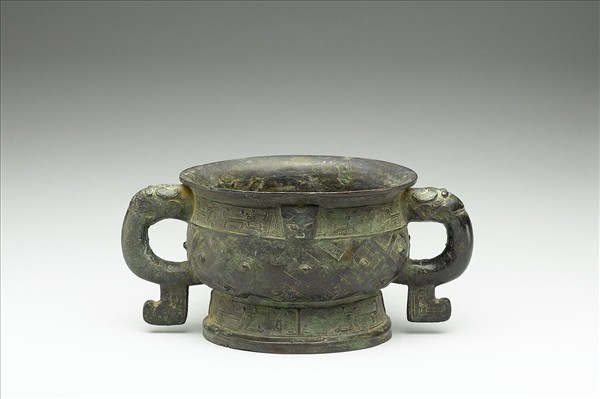 圓簋,雙耳,圓腹,圈足,耳做獸首形,下有附珥,圈足外有外凸的圈足座。口沿與圈足皆飾夔龍紋,腹飾棱格幾何紋與乳釘紋,以雷紋為地。