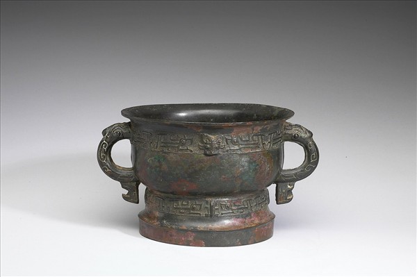 圓簋,侈口,雙耳,圓腹,圈足,耳作獸首形附珥,圈足一側有几形缺口。頸、足飾夔紋,頸中央有小獸首,均以雷紋為地。