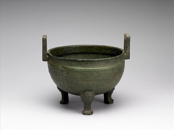 鼎,折唇,附耳,束頸,圓腹,獸足。器腹有兩道凸棱,上半部飾蟠螭紋,下半部有三角形紋。