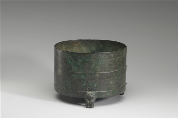 奩,圓筒形器身,深直壁,平底,三獸足。器外壁飾帶紋。