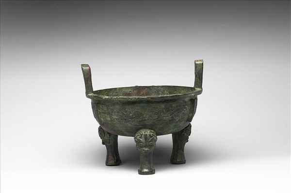 圓鼎,盤口,立耳,獸足。腹飾大鳥紋,中有棱脊一道。器內有銘三行。