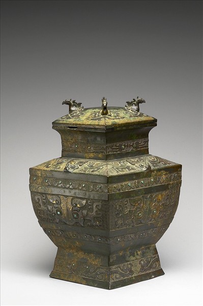 方罍,梯形蓋,盤口,短頸,折肩,方腹,圈足,蓋上有四小獸首立雕,器肩上有四小獸首。蓋、肩部與圈足飾鳥紋,頸、腹上部有夔紋,器腹為獸面紋,以雷紋為地。紋飾以鑲嵌錯金銀技法表現。器內底有銘文。