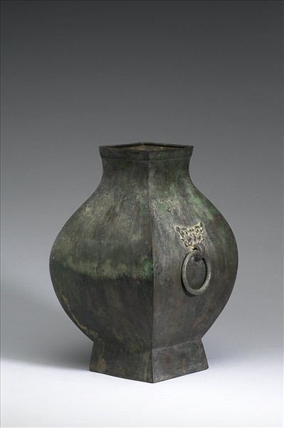 鈁,方口,四壁圓曲,方足微撇,肩作二獸面銜環。