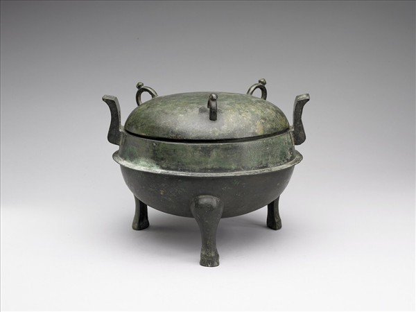 鼎,帶蓋,附鈕蓋,子母口,附耳,圓腹,蹄足,蓋上有三立環耳。器腹飾一凸棱。