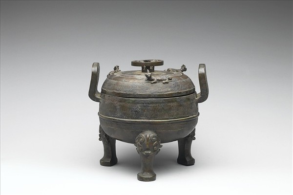 附蓋圓鼎,腹呈球形,雙耳,子母口,蹄足,蓋飾三臥獸。蓋、腹飾蟠虺紋,腹中有弦紋,足飾獸面紋。