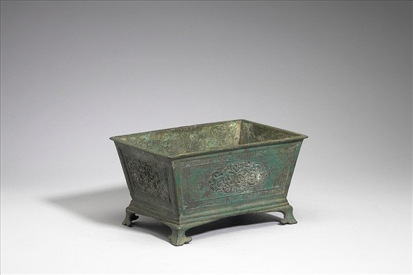 方爐,折沿,腹微斂,四足。腹飾唐草紋、雲雷紋為地。