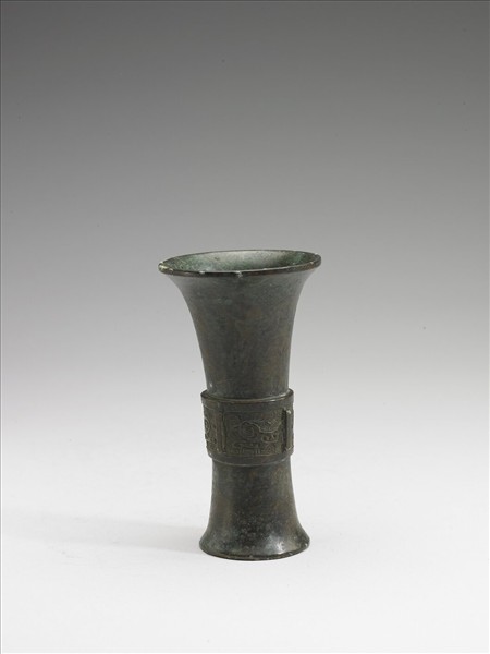 觚,侈口,直筒腹,圈足。腹有棱脊。腹飾鳥紋、雲雷紋為地。