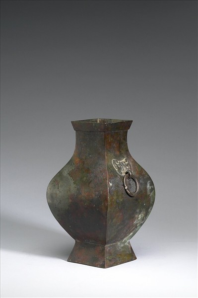 鈁,方口,四壁圓曲,方足微撇,肩作二獸面銜環。