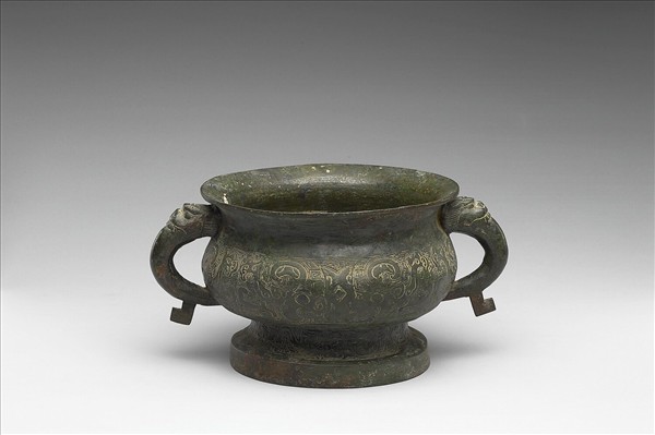圓簋,侈口,雙耳,縮頸,圓腹、圈足,耳作獸首形附珥。腹飾獸面紋,足飾動物紋,均以雷紋為地。