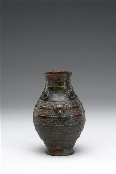 圓壺,鼓腹、圈足,頸上四環,肩上二獸耳。頸飾雲紋,腹飾垂鱗紋,足飾波浪紋。