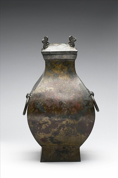 盤口,短頸,斜肩,鼓腹,圈足,平頂梯形狀蓋,蓋上有四繫。器肩兩側有銜環鋪首。