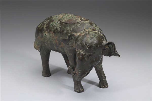 全器以象為造型,象鼻下垂,四足著地,尾向右側偏,背有一蓋瓶。象頸有項圈,象首微向左傾,前足微曲。